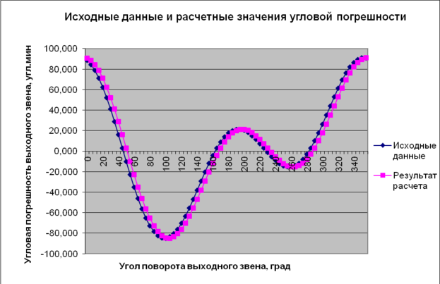 Рассчитанные параметры ряда Фурье для составляющих погрешности передачи (редуктора) позволяют построить зависимость суммарной погрешности от угла поворота выходного звена. На рисунке эта зависимость совмещена с исходными данными.