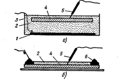 а — при погружении изделия в электролит, б — при наливе электролита на поверхность изделия; 1— пластина, 2 — электролит, 3 — сосуд, 4 — изделие, 5 —электрод, 6 — валик