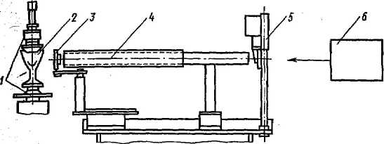 Однопозиционная лазерная установка для гравирования стекла (рис. 1.13) состоит из лазера 6, электромагнитного клапана 5 для прерывания излучения после окончания цикла обработки, телескопической трубки 4, фокусирующей линзы 3, пропускающей излучение с волнами длиной 10,6 мкм, системы 1 закрепления и заданных перемещений изделия 2. Установка может комплектоваться качающимся столом, копиром, приспособлениями для колебания и вращения линзы, позволяющими получать на изделии волно- и петлеобразные линии. За счет комбинирования движений изделия и фокусирующей линзы можно получать очень сложные рисунки.