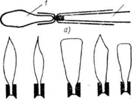 а — круглая, б, в, д — заостренные, г — тупая, е — плоская; 1 — обойма, 2 — ручка