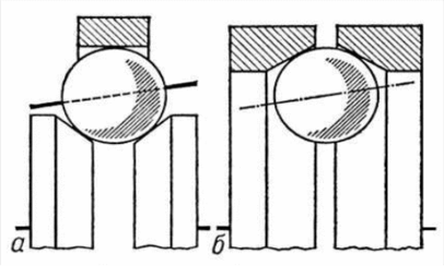 На рис. 3 показаны схемы некоторых БП., расположенных в порядке уменьшения геометрического скольжения. Многодисковые передачи (рис. 3, а), несмотря на невыгодную схему геометрического скольжения, широко применяются для средних и больших мощностей из-за благоприятных условий образования масляного клина в местах контакта и наличия большого числа узких контактных поверхностей. В лобовой БП (рис. 3, б) с коническим роликом при совпадении вершины конуса А с точкой А1 геометрическое скольжение отсутствует, а в других положениях оно существенно меньше, чем у передачи с цилиндрическим роликом (рис. 3, в). В схеме торовой бесступенчатой передачи (рис. 3, г) очень мало геометрическое скольжение во всех положениях роликов и практически отсутствует в положениях, когда вершина А конической поверхности, условно заменяющей сферическую поверхность ролика, находится в точках А1 и А2, на геометрической оси чашек. Передачи этого типа, выполненные с 2 и 3 роликами, отличаются высоким кпд и компактностью. Недостатком их являются сложность изготовления, ремонта и пониженная надёжность. Бесступенчатые передачи с точечным контактом имеет промежуточные стальные шары (рис. 4), положение физических или геометрических осей которых изменяется механизмом управления.