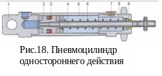 Рабочий ход в пневмоцилиндрах одностороннего действия осуществляется под действием сжатого воздуха. В исходное положение поршень возвращается с помощью встроенной пружины и от внешней нагрузки. В представленной конструкции (рис.18) корпус пневмоцилиндра 5 с обеих сторон закрыт крышками 1 и 8. В задней крышке 1 имеется отверстие для подвода сжатого воздуха, а в передней крышке 8 предусмотрено выхлопное (декомпрессионное) отверстие с фильтром 7. Внутреннее пространство цилиндра делится поршнем 2 на штоковую полость, в которой находится ш