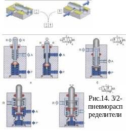апример, 2/2-пневмораспределитель: числитель указывает на количество коммутирующих линий, знаменатель – число возможных положений распределителя. На рис.14 показана графическая модель и условное обозначение 3/2-распределителя. Приведены схемы двух типов нормально закрытых пневмораспределителей: первый – со сбросом воздуха в окружающую среду (на условном обозначении это отражено треугольником, примыкающим вплотную к обозначению распределителя), второй – с выходом воздуха через подключаемый трубопровод (на условном изображении треугольник, обозначающий выход сжатого воздуха в атмосферу, соединён с распределителем вертикальной чертой). Нормально открытый 3/2-пневмораспределитель представлен в одном варианте.