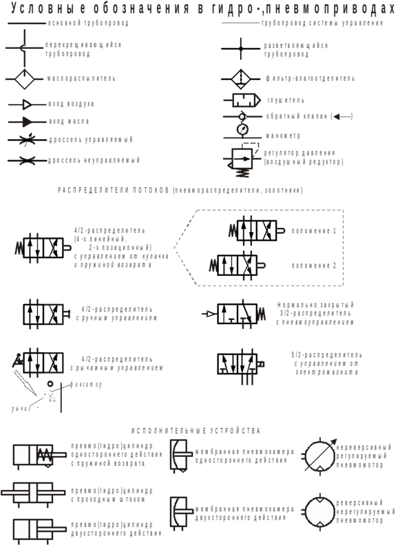 В качестве управляющих устройств используются воздушные распределители. Они имеют обозначения в виде дроби,