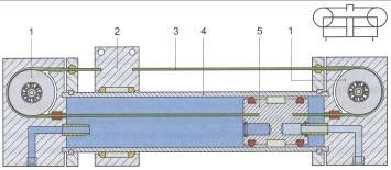 дним из конструктивных решений, позволяющих отказаться от традиционного штока, является пневмоцилиндр с гибким штоком. В этом устройстве роль штока возложена на покрытый полимерной пленкой (например, из нейлона) металлический трос 3 (или ленту). Трос охватывает ролики 1. Внутри гильзы 4 трос 3 связан с поршнем 5, а снаружи – с кареткой 2, которая воздействует на объект.Несмотря на свою простоту данная конструкция не получила широкого распространения.