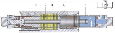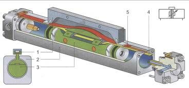 пневмоцилиндрах с магнитной муфтой (рис.24) усилие от поршня передаётся на внешнюю каретку за счёт сил магнитного взаимодействия. Оно осуществляется с помощью кольцевых постоянных магнитов, часть из них (магнитная полумуфта 2) размещена внутри цилиндра в поршне 1, другая часть (магнитная полумуфта 3) – снаружи в каретке 4, охватывающей цилиндрическую гильзу 5 (изготавливается из немагнитных материалов). При движении поршня 1 магнитное поле нижней полумуфты 2 захватывает верхнюю полумуфту 3, которая перемещает каретку 4 с объектом. При этом развиваемые усилия на выходном звене (внешней полумуфте 3) на 20 % ниже, чем у аналогичных пневмоцилиндров с механической передачей усилия от поршня. Кроме того, случайные перегрузки могут явиться причиной «разрыва» муфты. Вместе с тем, пневмоцилиндры с магнитной муфтой незаменимы при использовании в технологическом оборудовании с контролируемой средой, например в вакуумных установках. В