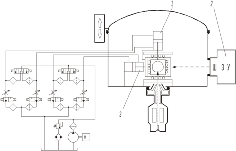 Другой вариант схемы УЭЛЭ изображён на рис.2.10. По этой схеме построена промышленная установка «Отелло-1» [1]. В ней для каждой координаты использованы гидроприводы, полностью размещённые внутри вакуумной камеры. Стол с пластиной и верхней кареткой приводится в движение гидроприводом 1, а нижняя каретка перемещается гидроприводом 3 в поперечном направлении. Система управления отслеживает перемещение пластины с помощью датчиков, закреплённых на верхней каретке. Загрузка пластин в камеру с помощью шлюзового устройства 2 позволяет сократить потери времени на создание требуемого вакуума.