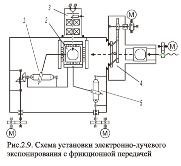 Экспонирование полупроводниковой пластины проводится электронно-оптической системой 3. Закреплённая на координатном столе 2 пластина совершает по программе линейные перемещения с помощью приводов 1 и 5. Каждый привод состоит из шагового двигателя, понижающей зубчатой передачи, ввода движения в вакуум и фрикционной передачи, сообщающей поступательное перемещение соответствующей каретке. Движение по каждой координате отслеживается датчиками положения и управляется ЭВМ с помощью шаговых двигателей в две ступени. Первая ступень управления соответствует большой скорости перемещения координатного стола из позиции в позицию, а вторая ступень – малой скорости для доводки стола в зону останова. Погрешность перемещения привода должна быть около 1 мкм, в этом случае окончательное совмещение зоны обработки с рисунком на пластине осуществляется за счёт отклонения луча. В установке предусмотрена загрузка пластин через шлюз 4, снабжённый манипулятором и затвором. В приводе манипулятора использован шаговый двигатель, а также зубчатая передача и ходовой винт. Привод з