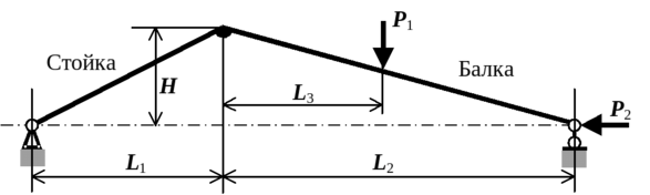 Стержневая конструкция (см. рис.1) состоит из двух жестко соединенных стержней, установлена на шарнирных опорах и нагружена силами P1 и P2 . Размеры конструкции и значения сил для разных вариантов задания приведены в табл.1. При заданных соотношениях сил левый стержень работает как стойка (преимущественно на сжатие), а правый – как балка (преимущественно на изгиб).