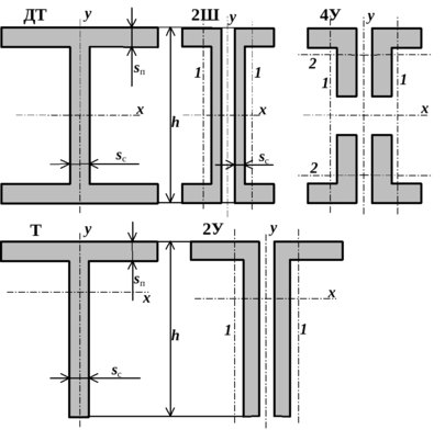 Рис. 2. Типы поперечных сечений: ДТ - двутавровое сварное или прокатное; Т - тавровое сварное или прокатное; 2Ш - два швеллера (сварных или прокатных); 2У - два неравнобоких уголка (прокатных); 4У - четыре равнобоких уголка (прокатных)