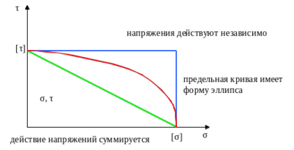 Это значит, что главное влияние оказывает больший из 2 компонентов напряженного состояния. По мере роста второго компонента, его влияние вначале незначительно, а потом плавно возрастает. Текущее рабочее состояние отображает на рис. 6 точка с координатами (σ, τ). Опасность разрушения возникает, если эта точка не находится внутри предельной кривой.
