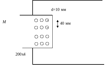 Пример 3: Сколько нужно рядов точек для обеспечения равнопрочности сварного соединения на рис. 37? Заданы допускаемые напряжения при растяжении основного металла