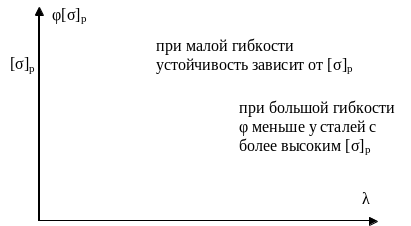 Однако при малых значениях гибкости найденное таким способом допускаемое напряжение превысит предел текучести и предел прочности стали (рис. 66). Поэтому условие устойчивости надо дополнить условием статической прочности.