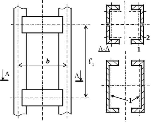 - гибкость относительно свободной оси, вычисляемая по формулам, как для сплошного сечения (для всего сечения стойки);