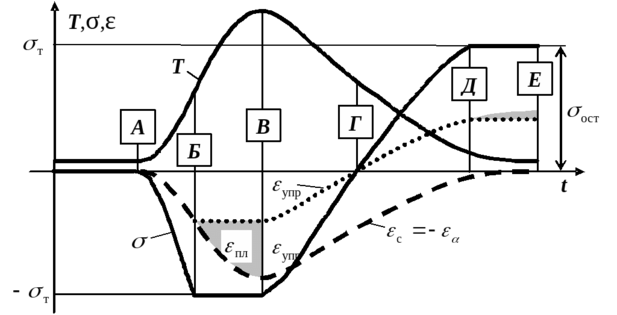 Если напряжение при нагреве не достигает предела текучести материала σт, то вся собственная деформация является упругой εупр (кривая εупр совпадает с кривой εс, а напряжение σ изменяется пропорционально εс), а при остывании происходит полная разгрузка и остаточные напряжения не образуются. Если же напряжение достигает σт (в точке Б на рис. 2), то рост напряжения и упругой деформации прекращается, дальнейшее увеличение εс при продолжении нагрева происходит за счет роста пластической деформации укорочения εпл.