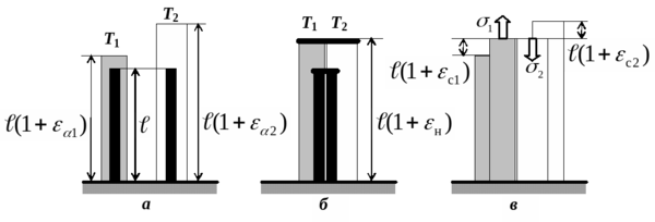 Рис.1. Деформации при неравномерном нагреве: а - свободная температурная деформация зон, нагретых до разных температур (Т2 > Т1); б – совместная наблюдаемая деформация скрепленных зон; в – собственные напряжения и деформации от взаимодействия скрепленных зон