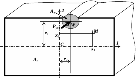 Рассмотрим поперечное сечение сварной конструкции с продольным швом. В общем случае ось шва не совпадает с продольной осью конструкции, а расположена с эксцентриситетами е1 и е2 от главных центральных осей сечения 1 и 2 (рис. 12). Параметры сечения: A = Аа + Ап - площадь, I1 и I2 – моменты инерции относительно главных центральных осей 1 и 2. Силы Pус и Pа приложены в точке W в центре активной зоны.