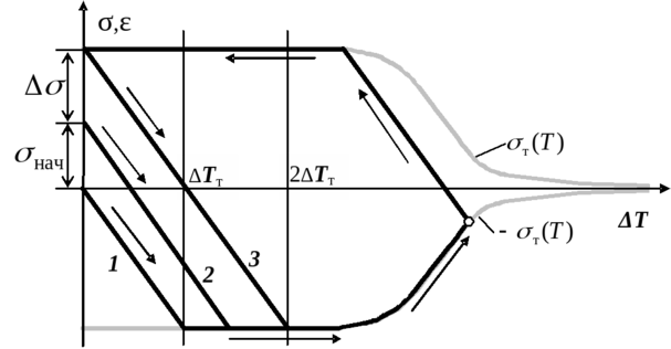 При растягивающих начальных напряжениях эта температура выше ΔТт, (активная зона сужается), а при сжимающих напряжениях температура ниже ΔТт, (активная зона шире, чем при отсутствии начальных напряжений). Зона, в которой начальные сжимающие напряжения близки к пределу текучести, испытывает пластическое укорочение даже при небольшом нагреве.