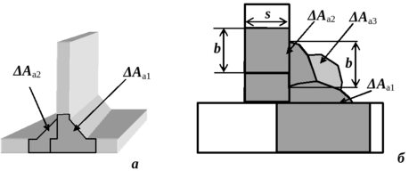 Если активные зоны от швов перекрываются, то в площадь ΔАаi входит только та часть активной зоны очередного шва, которая не перекрывается с предыдущими. В перекрывающихся частях активных зон начальные напряжения близки к пределу текучести и изменение напряжения в них не происходит. На рис. 15 показана схема определения ΔАаi от каждого прохода при двухсторонней сварке таврового соединения и при сварке многопроходного шва.