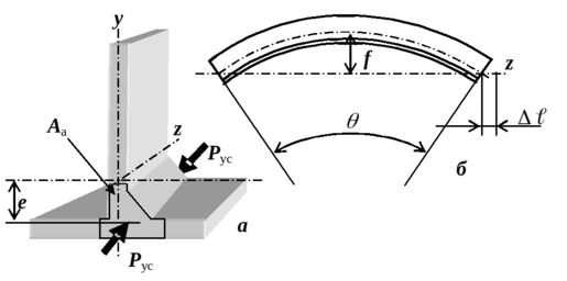 Кроме того, возникает изгиб продольной оси z. Изгибающий момент равен произведению усадочной силы на плечо, равное эксцентриситету e. Точка приложения усадочной силы – в центре зоны пластических деформаций от усадки шва (заштрихована на рис. 13, а). Эксцентриситет отмеряется от главной центральной оси сечения балки x. В результате изгиба концы балки поворачиваются относительно друг друга на угол