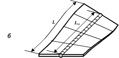 Существует несколько вариантов равновесной изогнутой формы листа. Первый вариант представляет собой цилиндрическую седловидную поверхность (рис. 40, а). Лист сворачивается в трубу так, что длина шва Lш становится меньше, чем длина краев листа L. Мерой искривления является радиус кривизны R. Второй вариант – винтовой (рис. 40, б). Лист закручивается пропеллером, причем шов остается прямым, а край листа идет по винтовой линии. Мера искривления - угол взаимного поворота переднего и заднего краев листа.