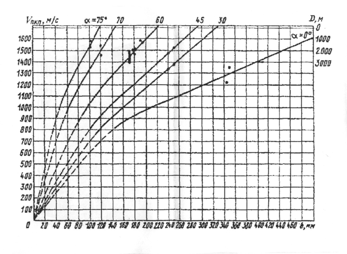 Расчет броневой защиты ведется при помощи номограммы, на которой указана зависимость необходимой для непробития толщины брони от дальности выстрела и угла встречи.