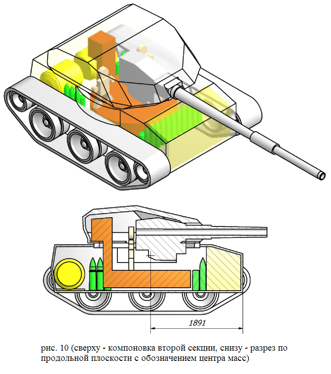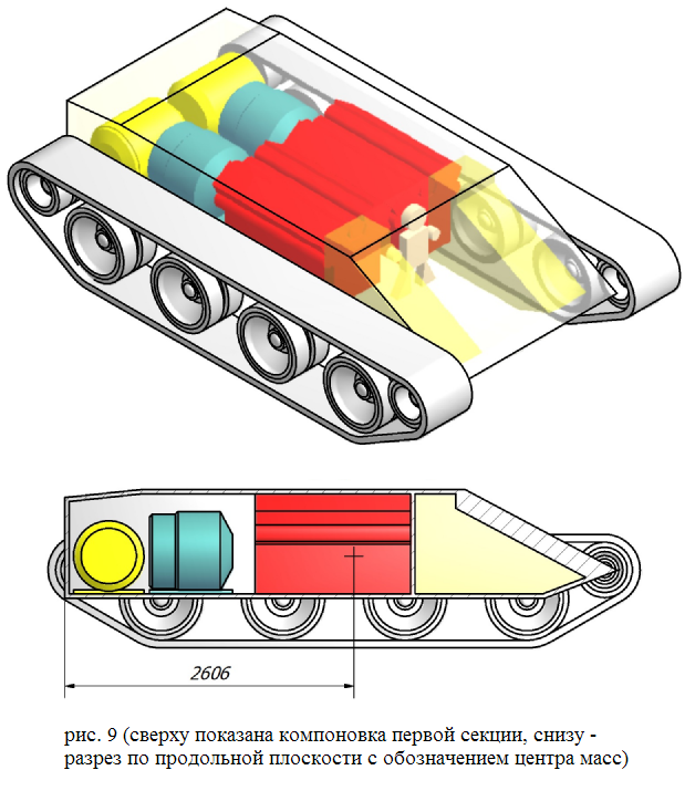 1. Была разработана компоновочная схема сочленённой гусеничной машины с расположением танковой башни на втором звене. Первая секция полученной компоновки может быть использована как в качестве первой секции основного боевого танка, так и в качестве первой секции любой другой сочленённой гусеничной машины (БМП, тягач).