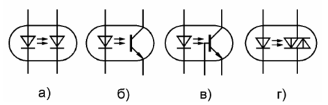 а) диодная, б) транзисторная без базового вывода, в) транзисторная с выводом от базы фототранзистора, г) симисторная.