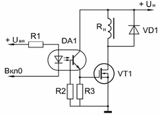 На рисунке 2 приведена схема ключа на МОП транзисторе. Если на выводе присутствует логический нуль, ток потечет через светодиод. Свет светодиода оптопары DA1 падает на базу фототранзистора той же оптопары, тем самым провоцируя пропускание через него тока. При открытии фототранзистора напряжение подается на затвор МОП транзистора VT1, что обеспечивает питание нагрузки Rн.