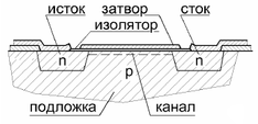 На кремниевой подложке p-типа методами ионной имплантации сформированы области n-типа, сток и исток. Потенциал стока больше потенциала истока. Затвор отделен от кремниевой подложки слоем диэлектрика толщиной в доли микрометра. При подаче напряжения в несколько вольт на затвор электроны из p-области подложки концентрируются под затвором, в результате чего образуется канал проводимости между n-областями (стоком и истоком), и электрический ток начинает протекать от истока к стоку. При снятии напряжения с затвора ток прекращается.