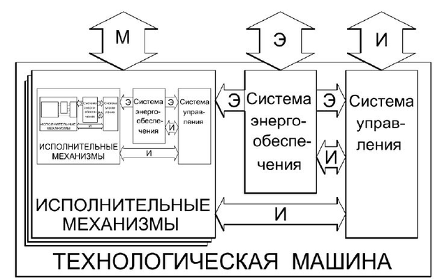 Соединены между собой и взаимодействуют подсистемы и элементы машины через материальные, энергетические и информационные потоки. Для каждого элемента или подсистемы можно выделить: целевой интерфейс, определяющий его назначение и способ взаимодействия в системе; механический интерфейс, определяющий расположение, крепление и подключение элемента к материальным потокам; энергетический интерфейс, определяющий виды и характеристики и правила взаимодействия питающих его потоков энергии; информационный интерфейс, определяющий виды, характеристики и правила (протоколы) обмена информацией на различных функциональных уровнях.