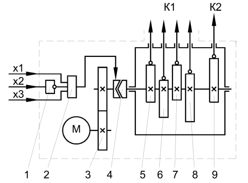 1. САУ с механическим командоаппаратом состоит из электродвигателя М, который через пару сменных шестерен передает вращения на распределительный вал, несущий кулачки, служащие приводом руки манипулятора. Вращение от двигателя на распределительный вал с кулачками передается через однообороную муфту. Кулачки перемещают манипулятор в горизонтальном и вертикальном направлении, а также поворачивают его.