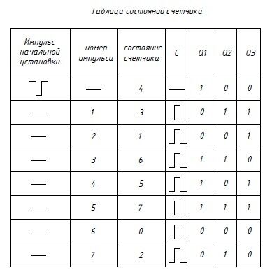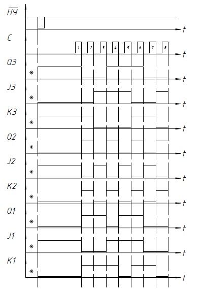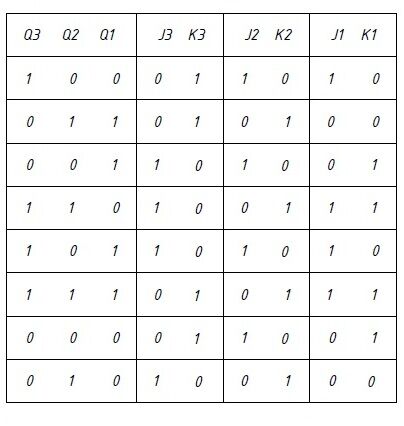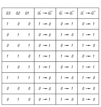 Задание на проектирование последовательностного устройства задано набором цифр и указанием, на основе какого типа триггера выполнять проектирование. Выходных сигналов устройства три: , , . Цифры задания указывают последовательность значений этих сигналов при переходах по сигналам .