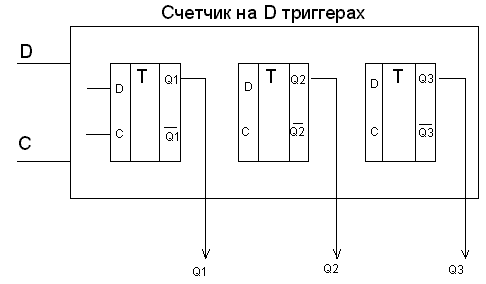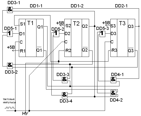 При h=3 –счётчик будет иметь 2h=8 состояний, что достаточно. Будем проектировать счётчик на 3-х JK-триггерах, а их выходные сигналы будут выходными сигналами счётчика.
