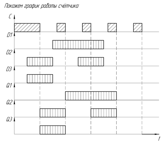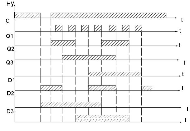 | Номер импульса | 1 | 2 | 3 | Десятичный код Q3t,Q2t,Q1t | ||||||