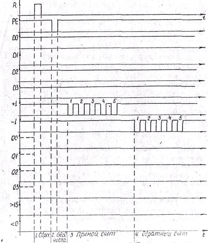Исходное положение переключателей: ГП1 - II, ГП2 - 12, S1 –1 , S2 - 3, S4-8. Подготовьте временную диаграмму (рис.5.20). Очистите содержимое счетчика (кратковременно переведите ключ S1 в положение 2). При выполнении действий, описанных в пунктах задания ниже, отобразите на диаграмме изменение на каждом этапе состояния выходных разрядов Q3 – Q0 и сигналов переноса >15 и < 0.