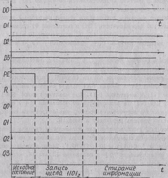 Исходное состояние: ключ S1 в положении 1 (на входе сброса R-низкий логический уровень R=0), ключ S2- в положении 3 (на инверсном входе РЕ - высокий логический уровень. РЕ=1 - запись не разрешена). Положение S4 и ГП2 - произвольное, ГЛ1 находится в положении II. Подготовьте временные диаграммы в соответствии с рис.5.19