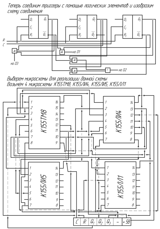 Выполнить построение электрической принципиальной схемы счётчика с произвольным порядком счёта рис.5.17. Для построения использовать JK-триггеры. Счётчик должен обеспечить последовательность выходных сигналов Q3, Q2 Q1: 000, 001,