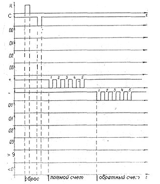 Для проведения опыта переключателем ГП2 введите обратную связь, обнуляющую содержимое счётчика при наличии на его выходе сигнала 01012(510) (переключатель ГП2 в положение 13). Подайте на входы счётчика число 00112(310), переведя ГП1 в положение 9. Выполните последовательно действия, описанные в разделе Б: сброс счётчика, запись числа 310, прямой счёт пяти импульсов, обратный счёт пяти импульсов. Результаты исследований отобразите на временных диаграммах, аналогичных рис.8.