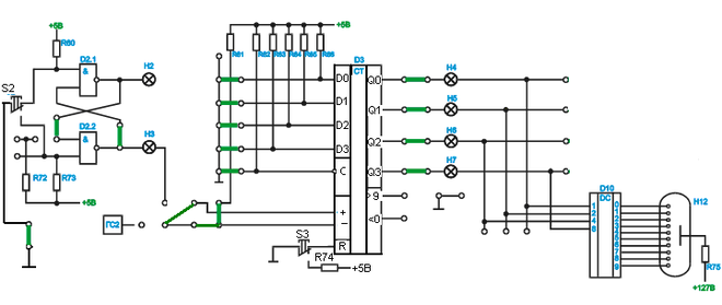3.3. В режиме вычитания при помощи перемычки вход (-) счетчика соединить с выходом микросхемы D2-2 , а вход (+) соединить с резистором R81. Не изменяя состояния счетчика, осуществите обратный счет (вычитание) пяти импульсов последовательным нажатием кнопки S2. Отобразите на временной диаграмме изменения выходных сигналов Q0-Q3 и сигнала <0 на каждом этапе счета.