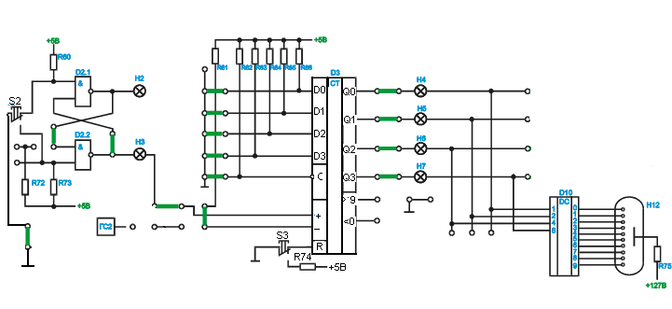 4.1. Заполнить таблицу 2 истинности семисегментного дешифратора, осуществляя прямой счет с нулевого состояния счетчика. Входной код фиксируем по индикаторам Н4-Н7, выходной определяем по индикатору Н12. Светящиеся сегменты соответствуют единичному уровню выходного кода.