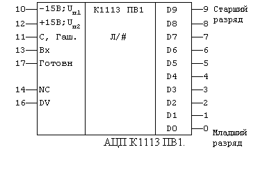 Приняв данные в системную магистраль, микропроцессор устанавливает на входе «Гашение и преобразования» АЦП уровень логической «1», который «гасит» информацию, содержащуюся в регистре последовательного приближения, и АЦП снова готов к приему и обработке входных данных. Микросхема К1113ПВ1 может обрабатывать входную информацию в виде однополярного аналогового напряжения до 24 В и двухполярного ±5, 12 В.