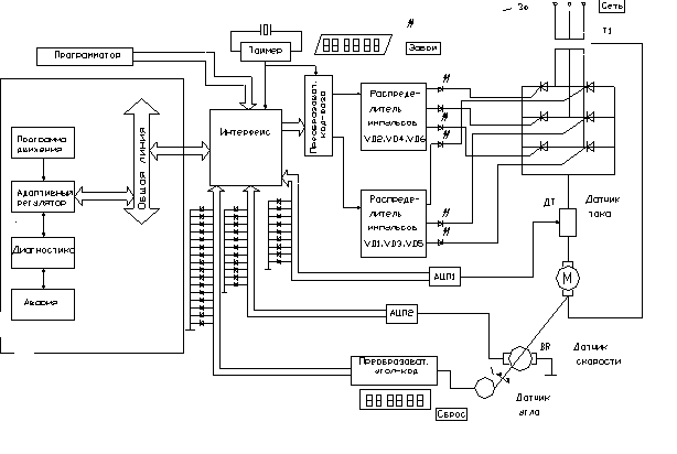 Преобразователь "код-фаза" преобразует параллельный двоичный код на выходе микроЭВМ в управляющие импульсы, фазовый сдвиг которых прямо пропорционален двоичному коду. Распределители импульсов в определенной последовательности обеспечивают на управляющих электродам тиристоров VDI...VD6 управляющие импульсы.