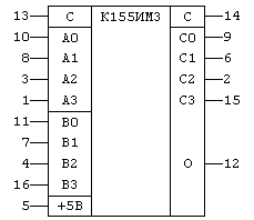 Сумматор К155 ИМ3 – быстродействующий полный сумматор, осуществляющий арифметическую операцию суммирования двух четырехразрядных слов в двоичном коде. Первое слово входы А0–А3, второе слово входы В0–В3. Вход С – сигнал переноса. Сумма двух слов – выходы С0–СЗ. Выход С – сигнал переполнения. Сумматор работает со словами как положительной (высокий уровень – единица), так и отрицательной (низкий уровень – нуль).