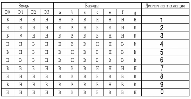 На входы D0, D1, D2, D3 подается двоичный код с реверсивных счетчиков DD6–DD10. Этот двоичный код преобразуется в семисегментный для обеспечения работы цифровой индикации. В таблице 4 представлена работа дешифратора.