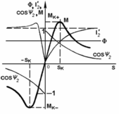 | Рис. 3 Зависимости параметров АД от скольжения [40] | cos 2 (косинус угла между векторами тока и ЭДС ротора) близок к 1 при малых s и асимптотически стремится к нулю при больших [40]. Магнитный поток Ф в первом приближении не зависит от s [40]. Ток ротора равен нулю при s = 0 и асимптотически стремится к U1/x2' при возрастании s [40]. Момент, как произведение трех сомножителей, равен нулю при s = 0 (идеальный холостой ход), достигает положительного Мк+ и отрицательного Мк- максимумов – критических значений при некоторых критических значениях скольжения ±sк, а затем при s→∞ стремится к нулю за счет третьего сомножителя [40]. |