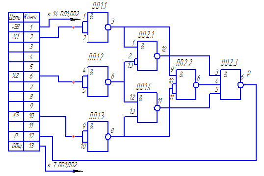 Схема электрическая принципиальная, реализующая преобразованное логическое уравнение в базисе И—НЕ, представлена на рис. 4.