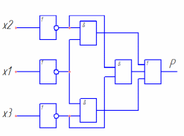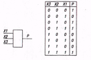 На входы комбинационного устройства поступают входные сигналы от трех датчиков. На выходе формируется выходной сигнал Р, равный 1 при десятичных кодах входных величин 0,1,2, 4. При остальных кодах Р = 0.