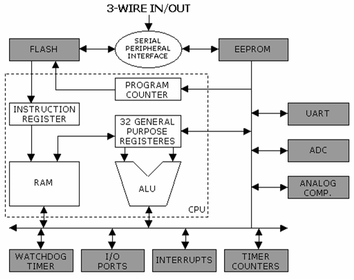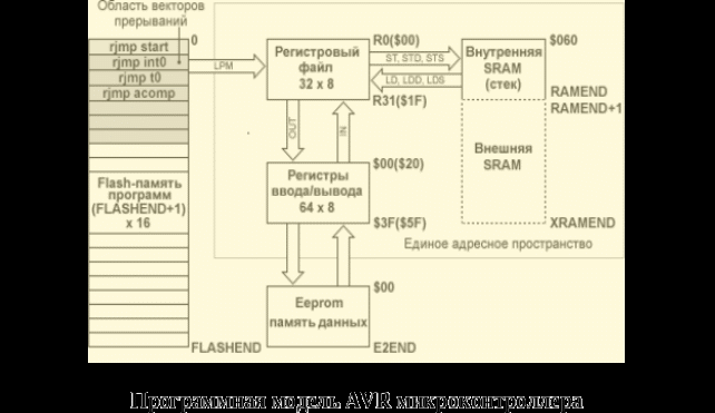 C точки зрения программиста AVR-микроконтроллер представляет собой 8-разрядный RISK-микроконтроллер, построенный по гарвардской архитектуре, имеющий в своем составе: