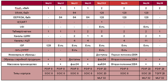 Таблица 1. Микроконтроллеры AVR семейства "tiny" в 2003-2004 годах.